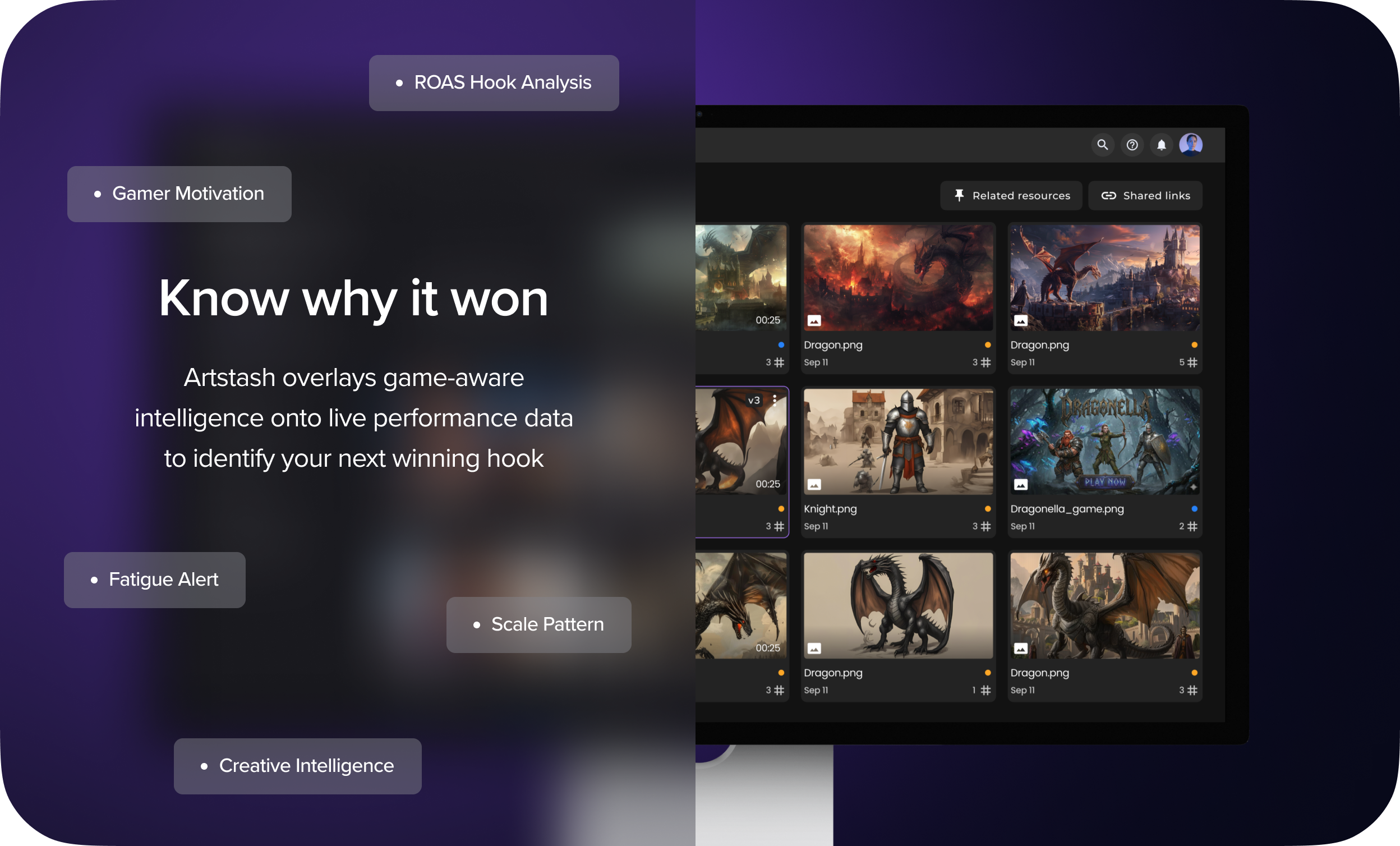 Artstash connects live performance data with game-aware creative intelligence, so UA teams know what to scale, what to kill, and what to test next.